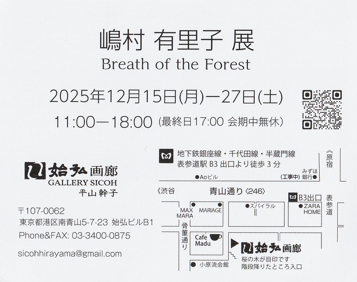 嶋村有里子展 Breath of the Forest 2025年12月15日(月)~27(土) 嶋村有里子 2009年/美術・油絵 嶋村有里子展 Breath of the Forest 会期:2025年12月15日(月)~27(土) 11:00~18:00 会場:始弘画廊